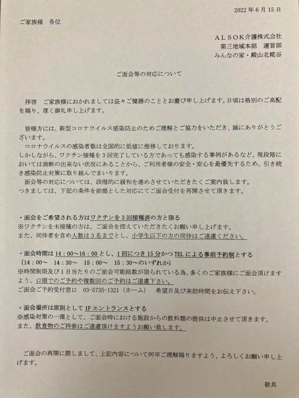 みんなの家殿山北糀谷☆★☆【お知らせ】面会の再開に関して☆★☆