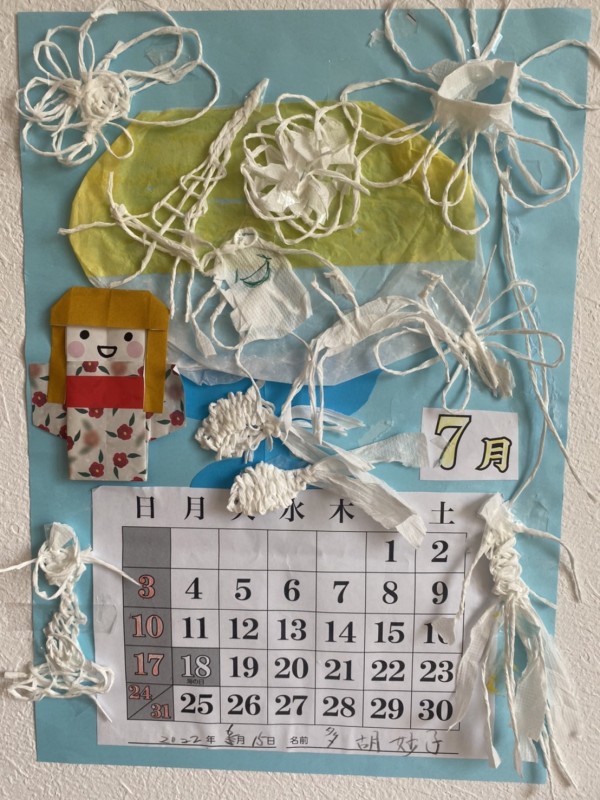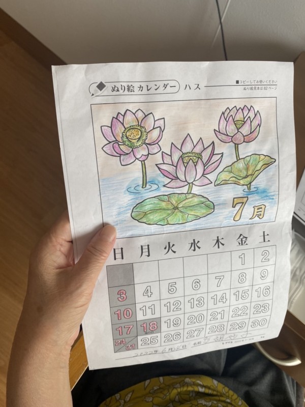 『7月のハスの塗り絵、完成したのよ♬向日葵は元気が出るから大好きは花♡』と笑顔で見せてくださるT様♡