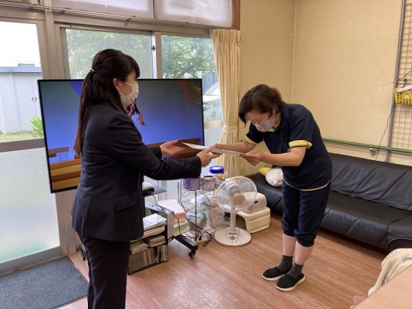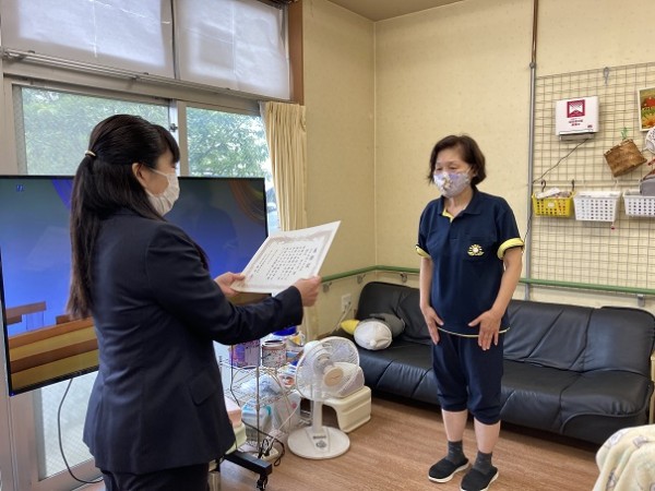 ですが長きに渡り会社に貢献して下さった事実は変わる事はなく清河寺2の利用者様とスタッフで盛大な拍手の下、賞状を恥ずかしそうに授与されておりました。