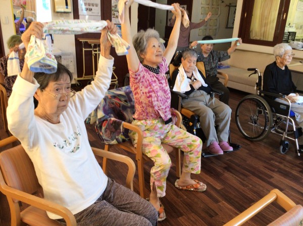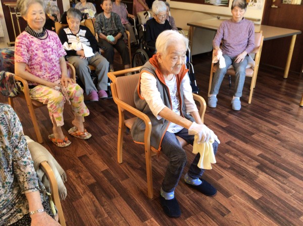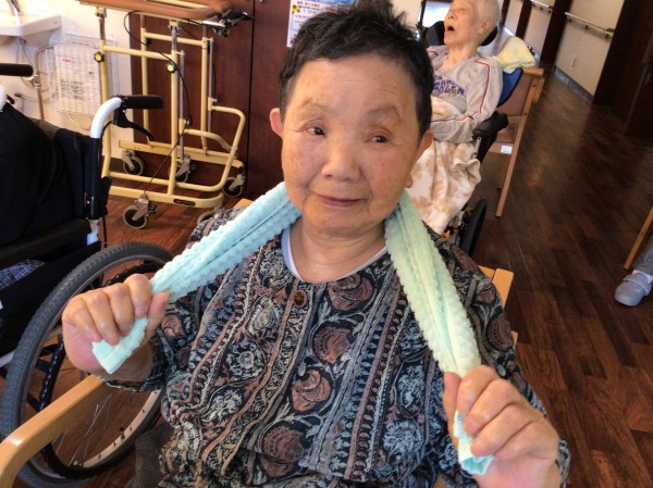 タオルを使用して体操は少しだけ難しそう…(´;ω;`)