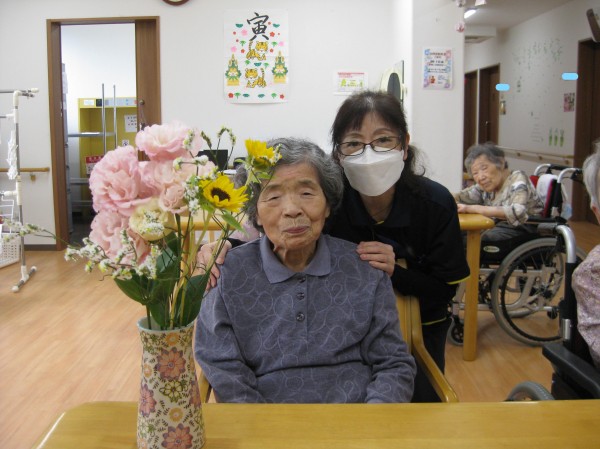 こんにちは!グループホームみんなの家・あきがせの介護ブログです!よろしくお願いいたします。今月はお嫁様からのお花のプレゼントをお持ち下されたご様子をお知らせいたします!!