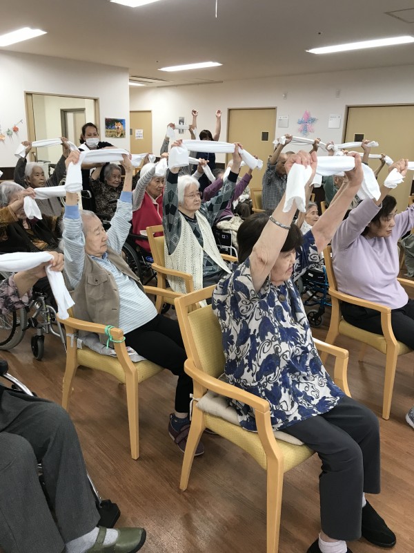 体操の先生をお招きして、みなさまでタオルを使用しての体操を行いました。