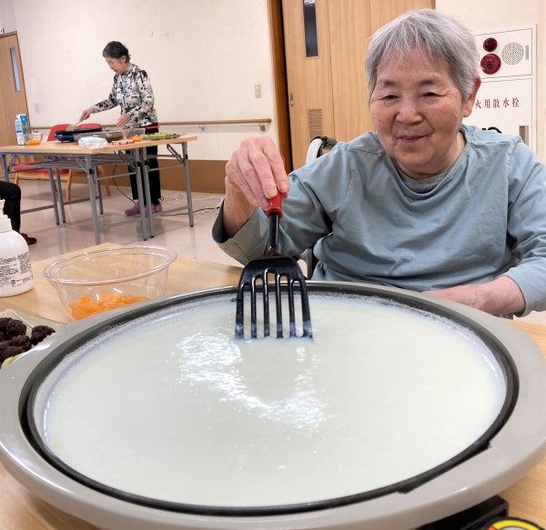 よくかき混ぜて、ホットプレートの電源を切って談笑していると、少しずつ固まってきました♪