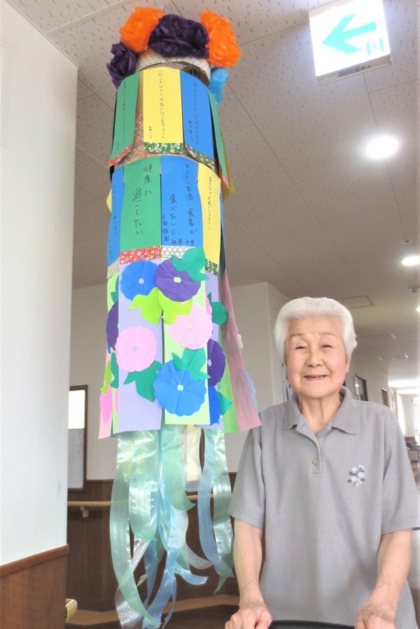 先月から作っていた吹き流しがやっと完成して七夕祭りの間に合いました。