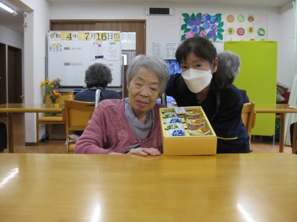 お誕生日会おめでとうございます! 7/15に89歳になりました。いつまでもお元気に健康でお過ごしになられますようにお祈りいたします!(^^)! 息子様と娘様からモンブランとプリンアラモードのケーキにゼリーのプレゼントに嬉しそうでした( ^ω^)・・・ 早速頂いちゃいました????