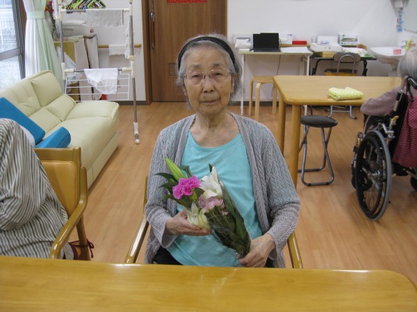 こんにちは! グループホームみんなの家・あきがせの介護ブログです! よろしくお願いいたします。 7月、誕生日なのでお花のプレゼントをお持ちになられました。