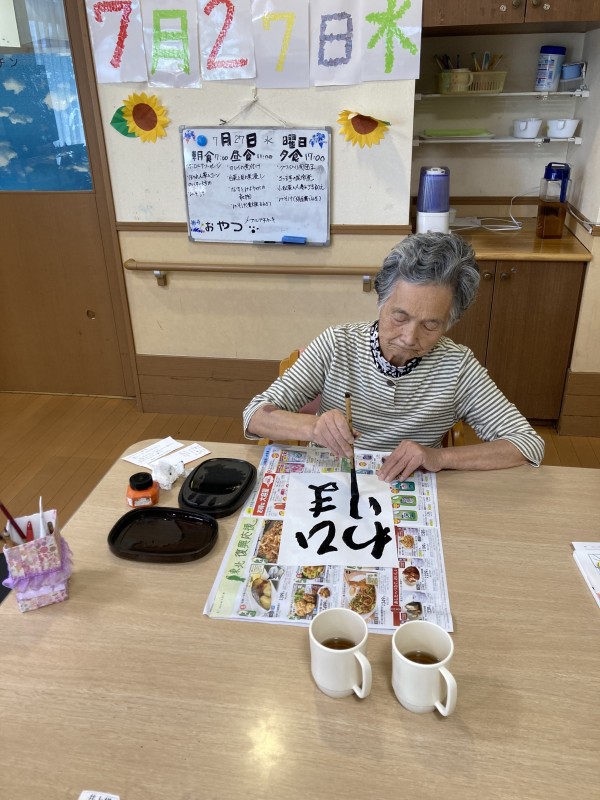 本日は1Fに2Fの入居者様をお招きして、お習字の先生をされていたというS様とともにお習字レクを行いました(^^)/