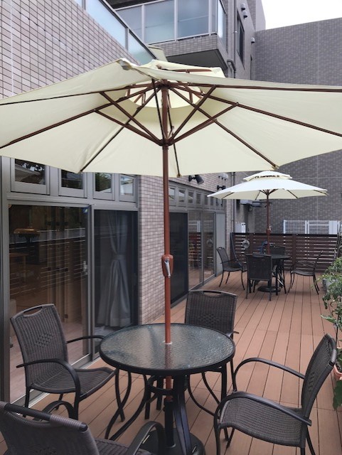 新しいパラソル付テーブル・椅子を営業Sさん・営繕Fさんが中心となって