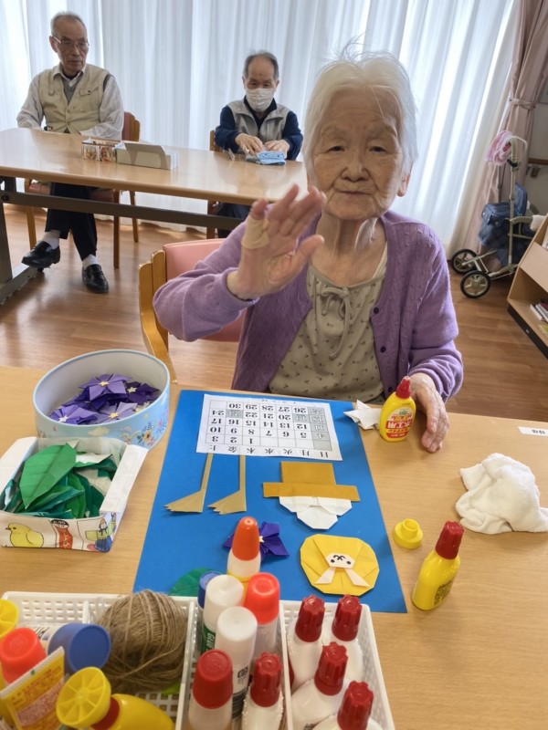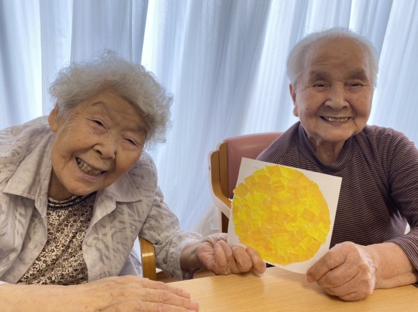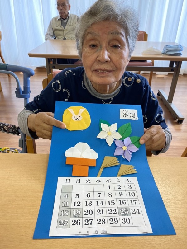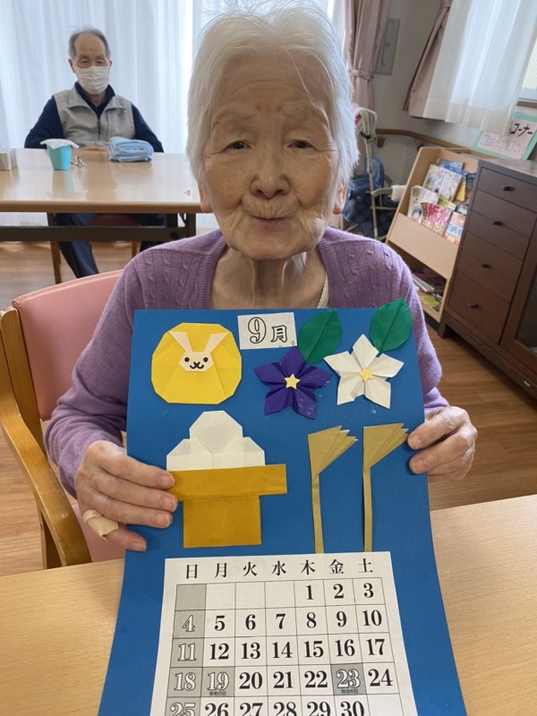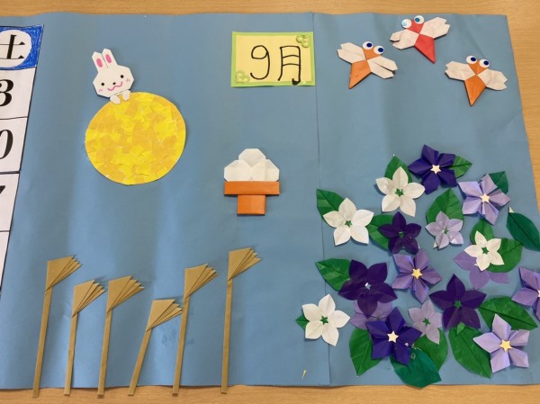 スタッフと一緒に少しずつ折り紙制作した『ススキやお月見団子』などの秋の風物☆も一緒に♬