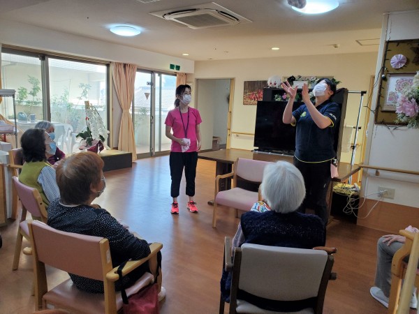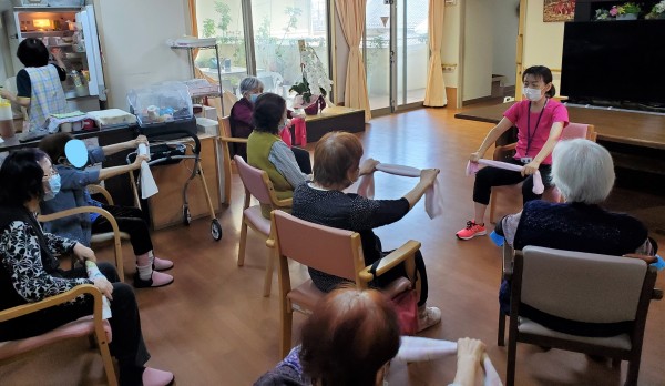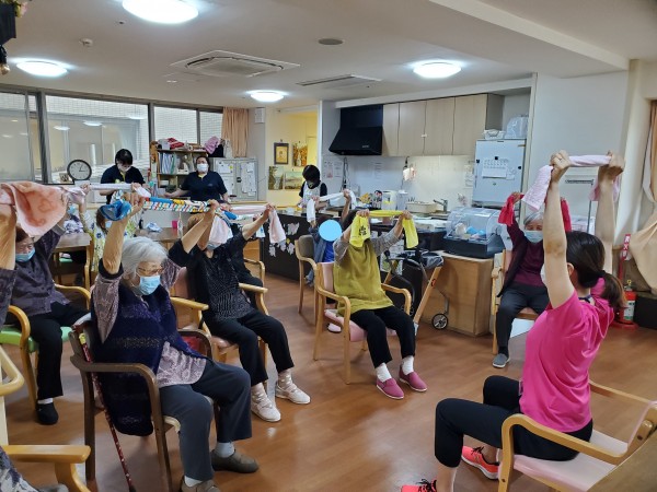タオル体操だと気合いの入るご利用者様に負けじと、職員も前に出て頑張っています!!