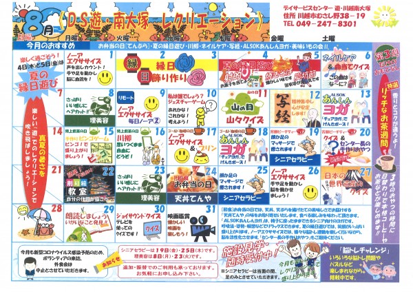 今月のレクリエーションは、夏の縁日遊びや、飾りを作る日もあります。一緒に作って参加するなんて、ワクワクしますね。シニアセラピー、ノーアエクササイズ、ALSOKあんしんヨガ、お弁当の日 今月は【天丼てんや】の天ぷらですね。暑さに負けず今月も楽しみましょう♪