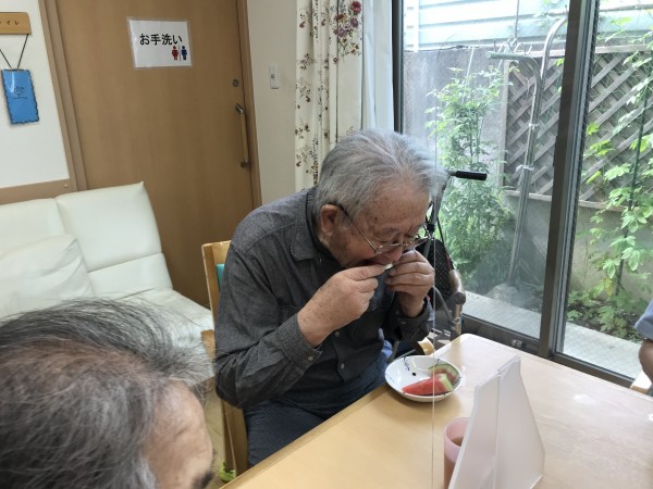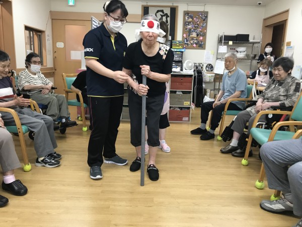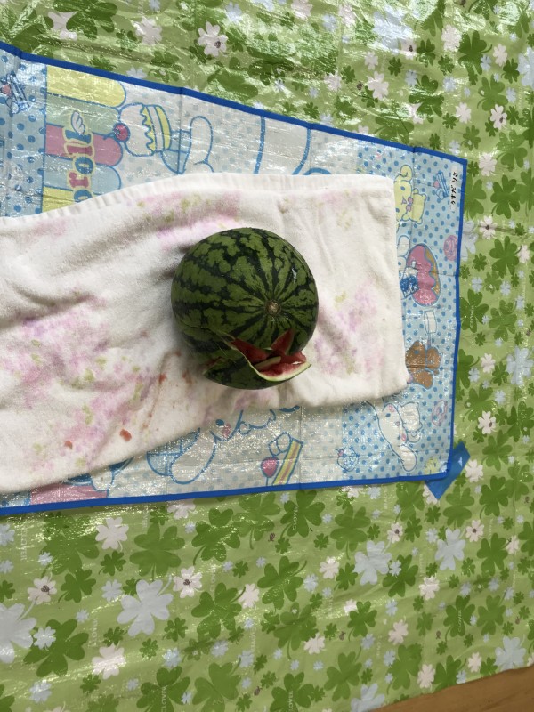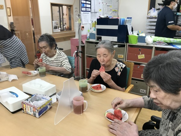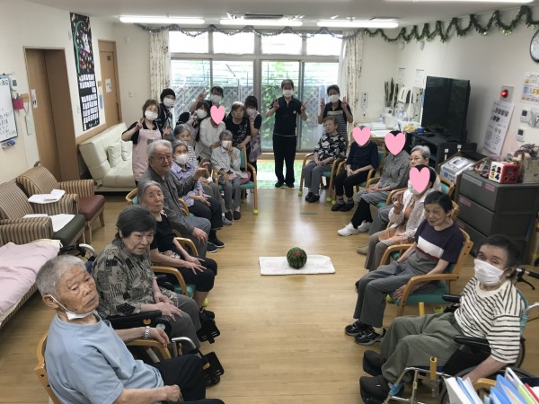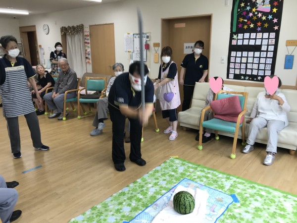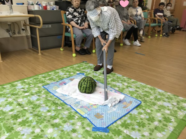 前回のブログの食事レクリエーションを行った日の午後にスイカ割りを行いました!