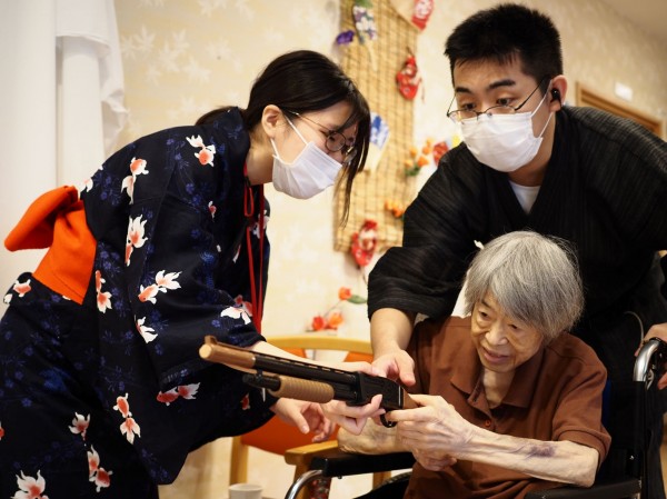 ホーム長やケアリーダーの的に命中させるご利用者様や