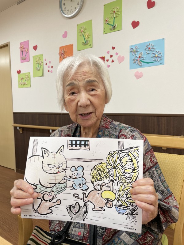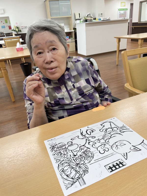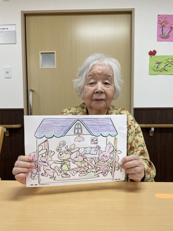 ご利用者様にどんな歌詞だったかを伺うと歌いながら色を塗ってくださり、楽しいひと時になりました♬