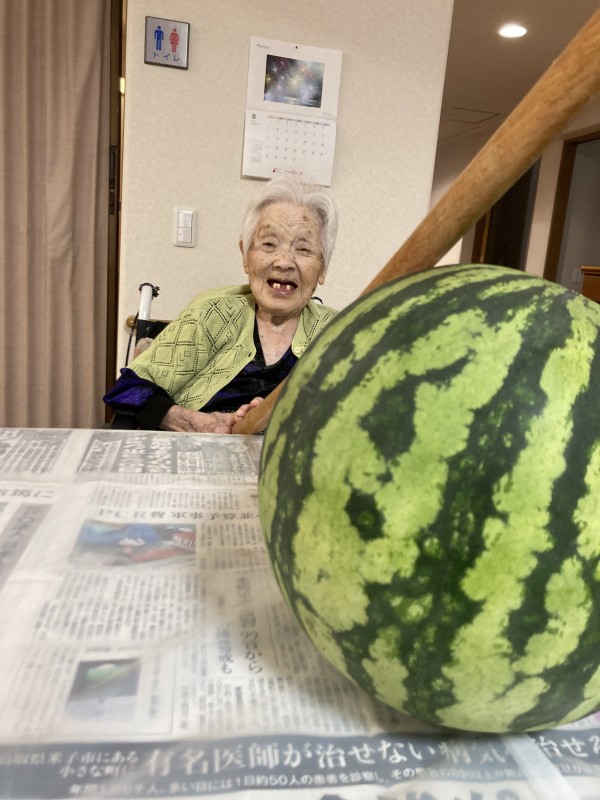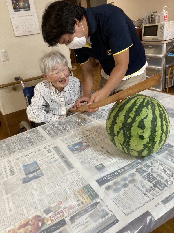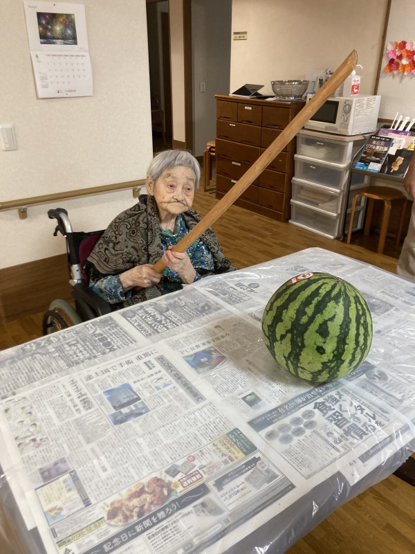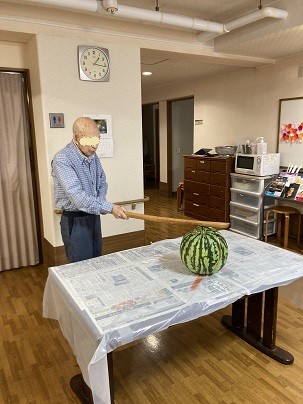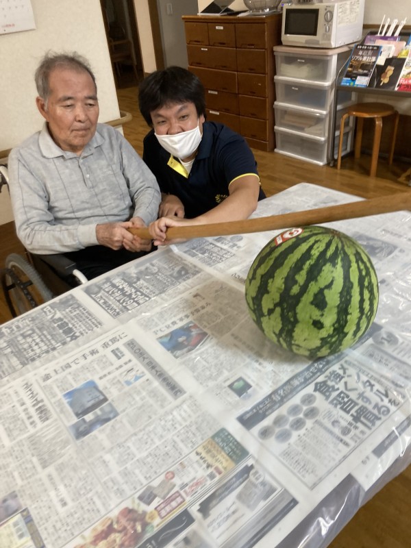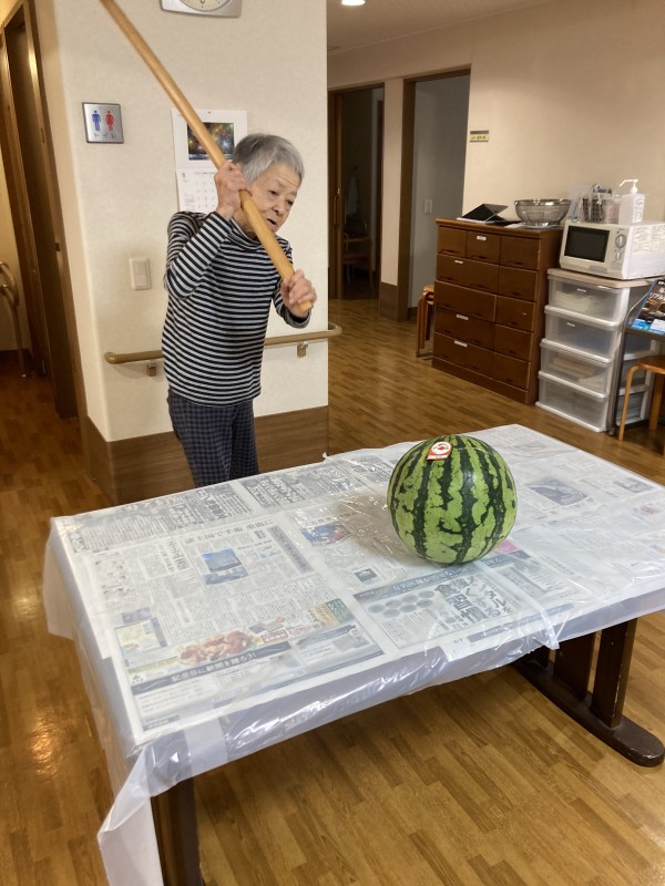 棒を振り飾り、「えい!」と気合を込めて取り組んでたり、「スイカが可哀そう・・」と叩いた後に撫でたりと様々でした。