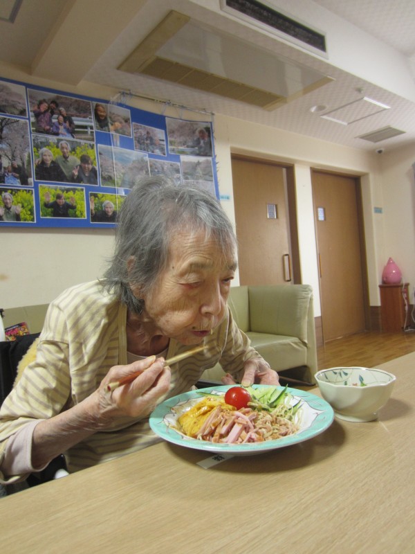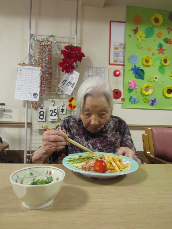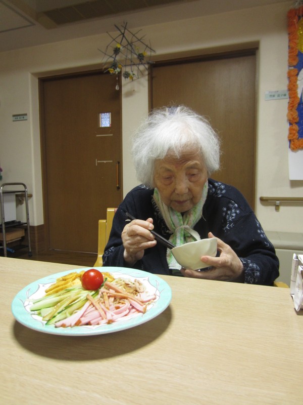ご利用者様に「この玉子は甘くて美味しいですね。このソーセージも柔らかくて美味しいですね。」と仰っておられて、とても笑顔で真剣に召し上がっておられました。ご利用者様は「私は麺が大好きです。」と仰っていたので冷やし中華を作って良かった思いました。