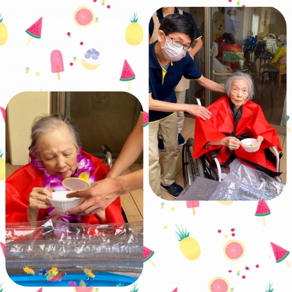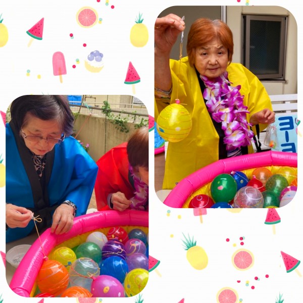 西尾久の納涼祭、お次はハッピに着替えてウッドデッキにて金魚すくいとヨーヨー釣りを楽しんでいただきました!