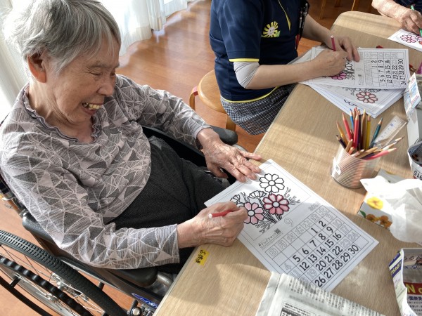 「どんな色がいいかな?」「コスモスってどんな色があったかしら?」と悩みながら、隣の利用者様が色塗りをしている様子を見て色を選んだり同じ色にしたり…
