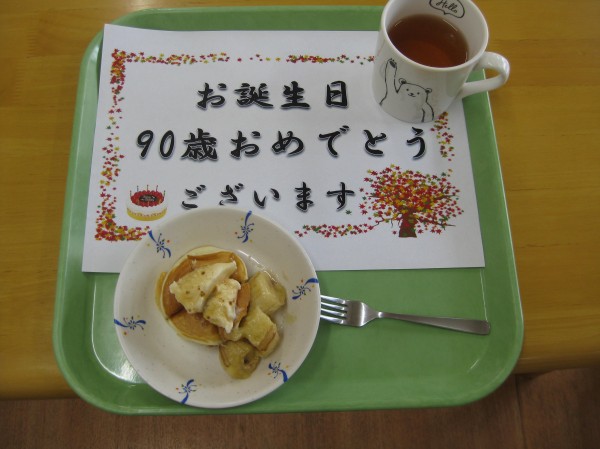 お誕生日おめでとうございます。 いつまでもお元気で楽しまれてください!! 90歳になりました。『もう90ですか? そうなんですか? 忘れちゃいましたb??』と話されました。これからもよろしくお願いします!とのことです( ^ω^)・・・ 誕生日の歌をみんなで歌いお祝いをしました!! 嬉しく涙目になっていました。ホットケーキを召し上がられ楽しいひと時をお過ごしになりました!!