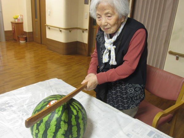 「いっせの!」と皆様は声に出して一生懸命にスイカを割られました。
