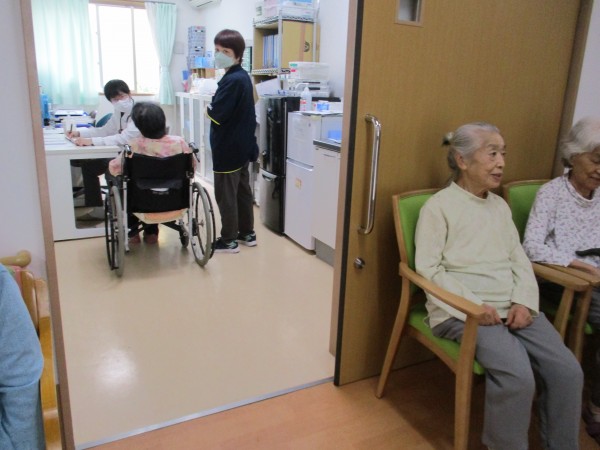 1階〜3階の入居者様が医務室前にいらっしゃり順番を待っていただいています!!