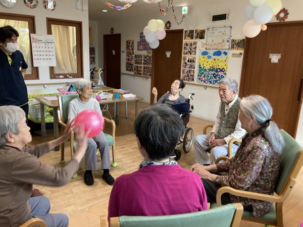 先日、フロアで輪になって皆様と一緒に「昔遊びレク」を行いました!