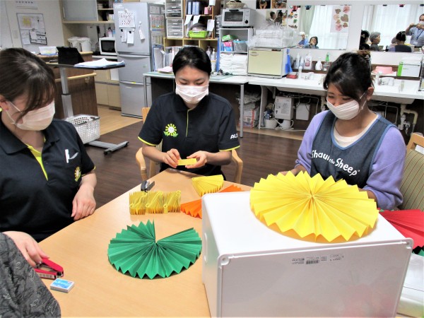 バックボードには、鶴・亀・寿の花と色とりどり大小の蛇腹の花をちりばめて作ります。