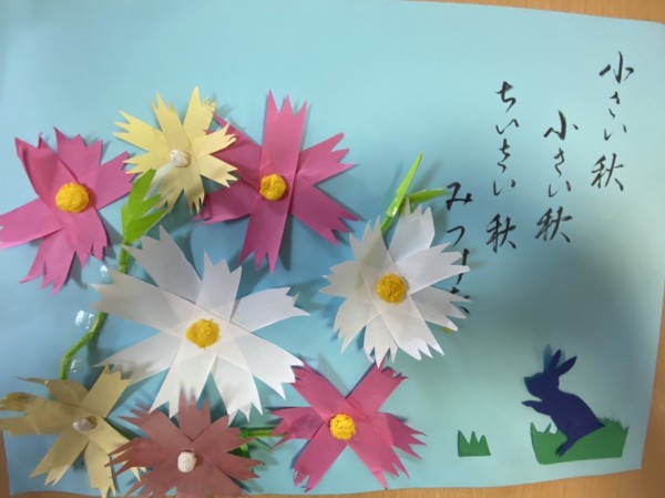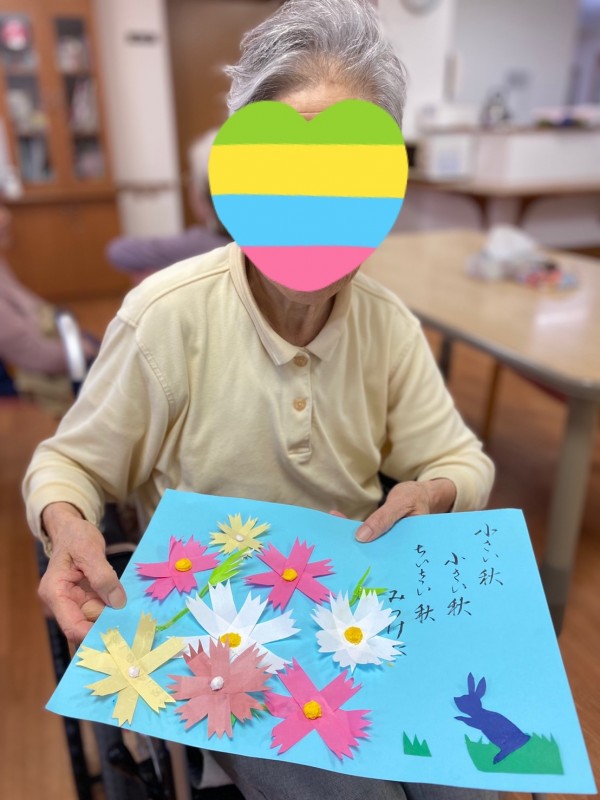 手指のリハビリの他に、秋の季節を表現する事で今を意識し季節感を味わう。生活意欲の向上も目的としています。