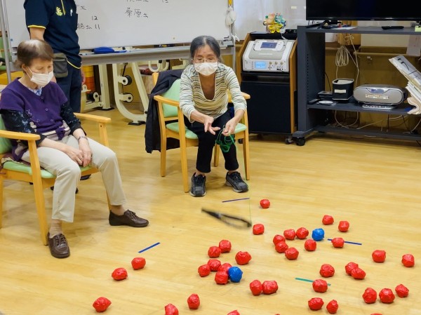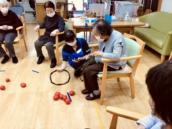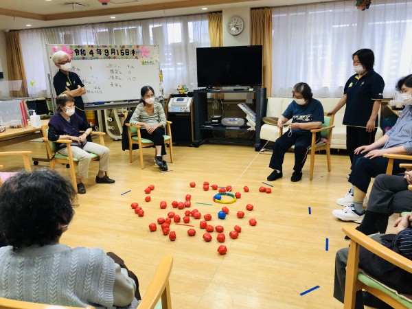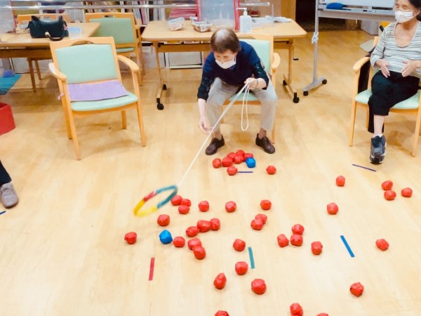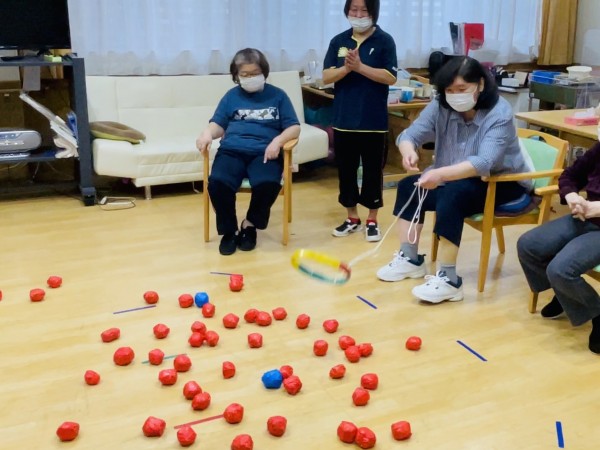 今回のゲームは青色玉と赤色玉を大漁の魚に見立て、時間内に輪っかの中に入れて地引網の様に