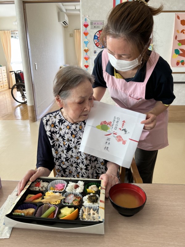敬老会 お弁当の内容を説明 「写真撮りますよ」