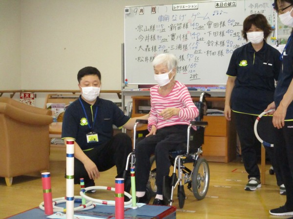 9か所の数字が表示している版に輪っかを投げ獲得した点数で競いました。皆さん慣れた手つきで輪っかを投げられました。がんばれ!!!