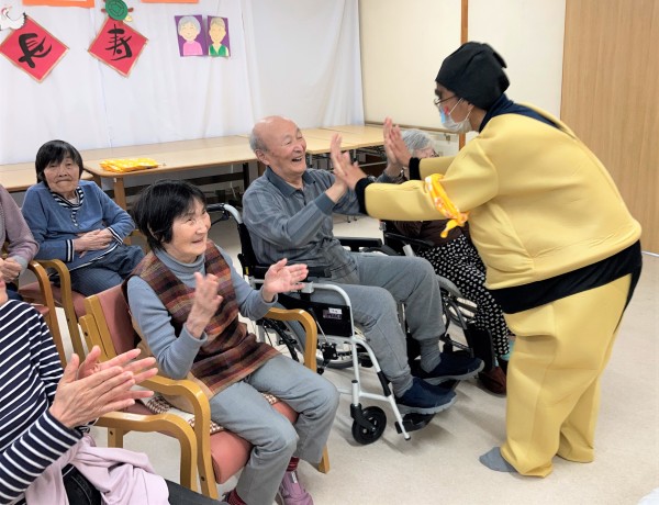 ホーム長からの挨拶はサクッと終わり、獅子舞のような珍妙な動きで登場するスタッフ♪