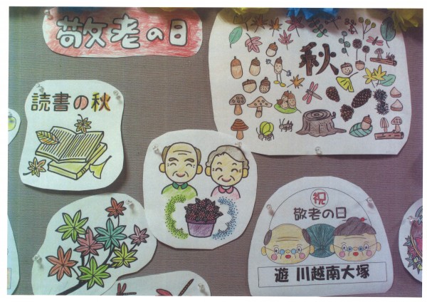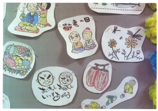 先日のレクリエーションで作成していただいた、ぬり絵やお花を飾りました。