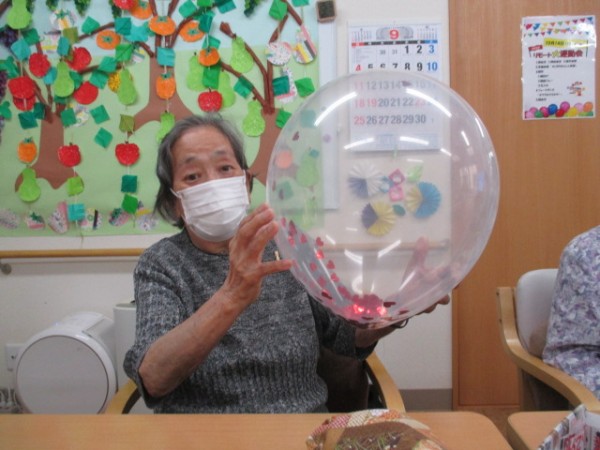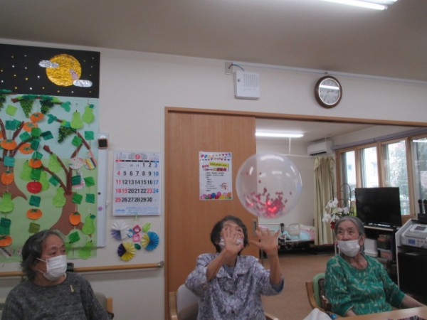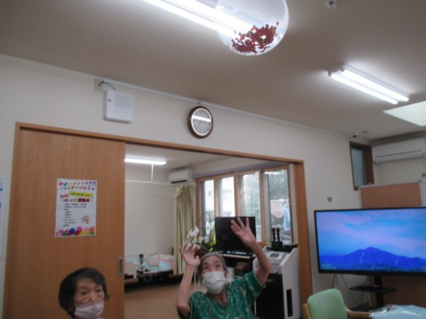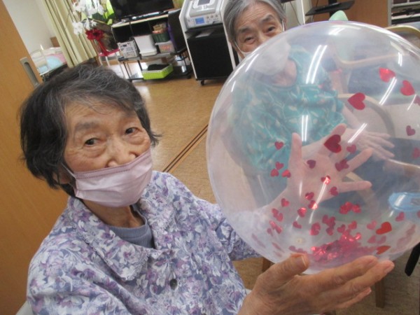 今日のレクリエーション活動は風船バレー!(^^)!・・・きれいなハートの模様が入っている風船で、皆様割れないよーーーにとそーーーとそーーーと風船バレーを楽しまれていました。おもいっきりでいいですよとお声掛けに「割れちゃったら可哀そうよ」と優しいお言葉