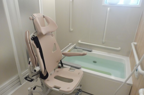 グループホームみんなの家・北綾瀬のお風呂場に設置された機械浴の椅子は、湯船に設置すると、動力で体の大きい男性も椅子があがります。
