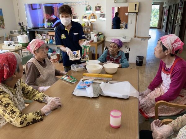 今回は皆様とおやつレクにて「豆腐入りお月見団子」を作りましたので、