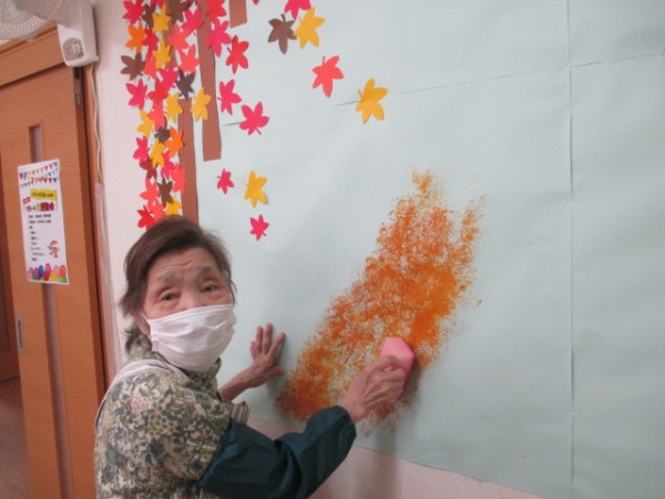 スポンジに絵の具をしみこませ・・・ポンポンと・・・モミジ街道製作中です!(^^)!さてどんな作品が出来るか楽しみです。