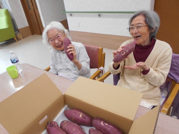 さつまいもの入った段ボールを皆さんの前にお持ちすると「わー大きいわね」「重たーい」と仰り、皆さんさつまいもを手に持たれています(^^♪