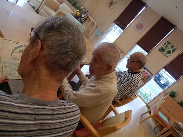 男性のご利用者さまのお一人が“ご自身の旅行記”を食堂で見ていたところ、他の男性ご利用者様たちが自然と集まってきましたぁ(^.^)