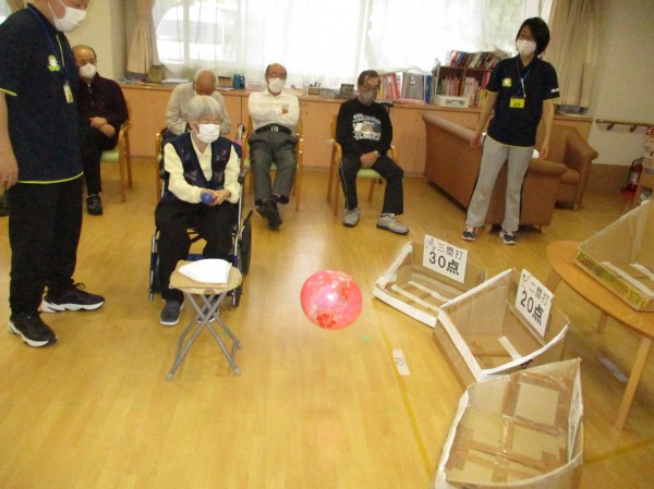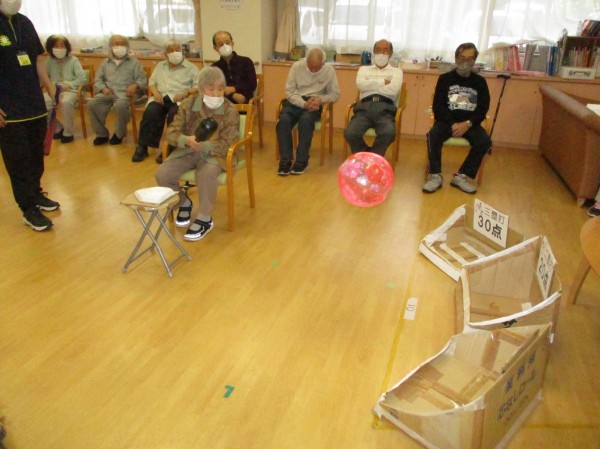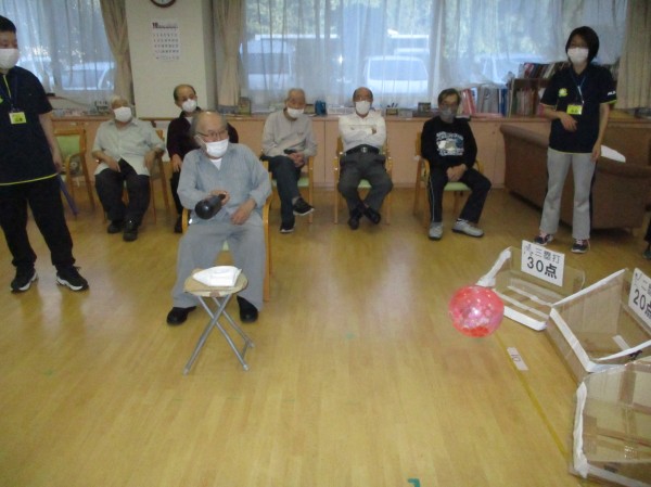 今日の運動レクレーションは『野球盤』です。1人5回振った得点の合計値で勝負です。皆様、日頃のストレス発散なのか
