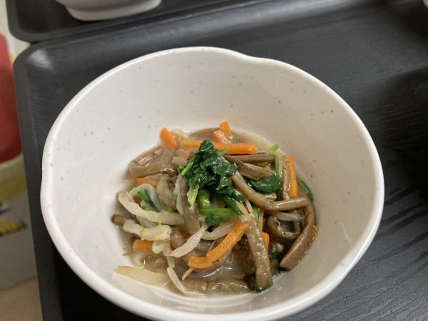 本日は、ぜんまいともやしのナムルにほうれん草を追加し、野菜の卵あえにリーフレタスを添えました。