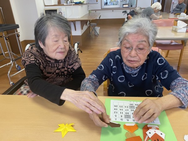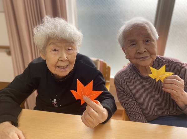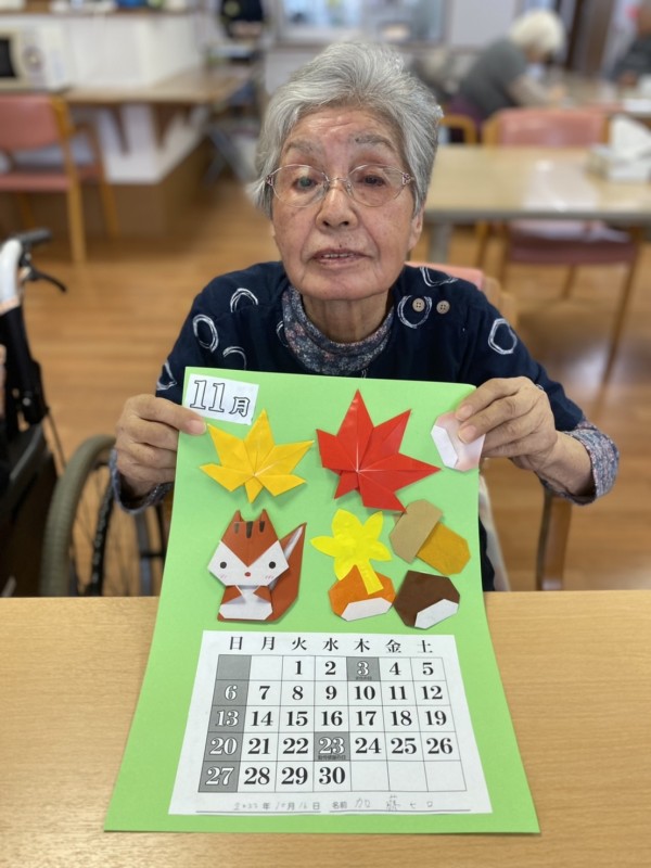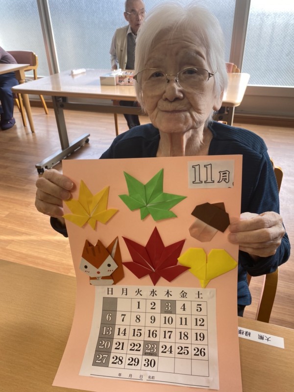 スタッフと一緒に作成した、『イチョウやどんぐりや栗』の折り紙と一緒に