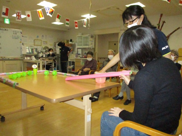7回球を転がし得た点数合計で競います。皆さん、初めての運動レクレーションで戸惑っていらっしゃいましたが、