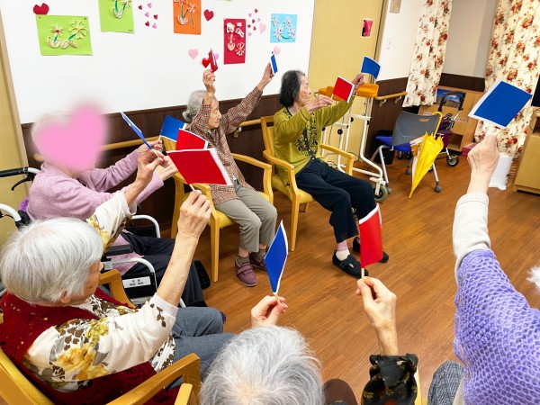 一人で行う振りの後、職員が順番にご利用者様の前に行き