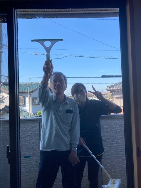 利用者様のU様に、「一緒に窓拭きを手伝ってもらえますか?」と聞くと、