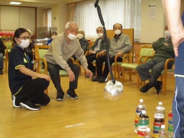 こんにちは!デイサービスセンター遊・西東京です!今日の運動レクレーションは『空中ボーリング』です。