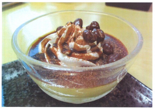 今日のトッピングは、ホイップクリームにチョコレートソースと麦チョコ。ココアパウダーが軽くかかっていて少し甘さを抑えた、大人味のプリンです♪
