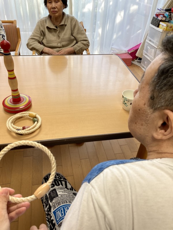 場面を変えてこちらでレクで他のご利用者様と輪投げをしています。