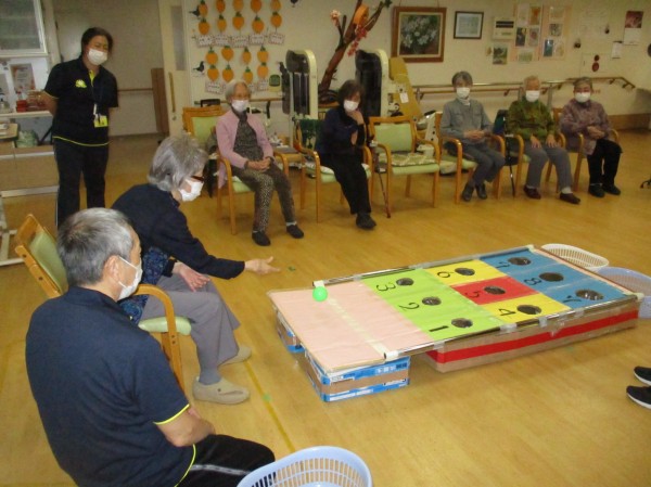 今回の運動レクレーションは『コロコロビンゴ』です!大きな箱の中を区分して穴があいています。穴には数字が書いてあります。