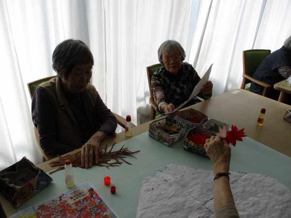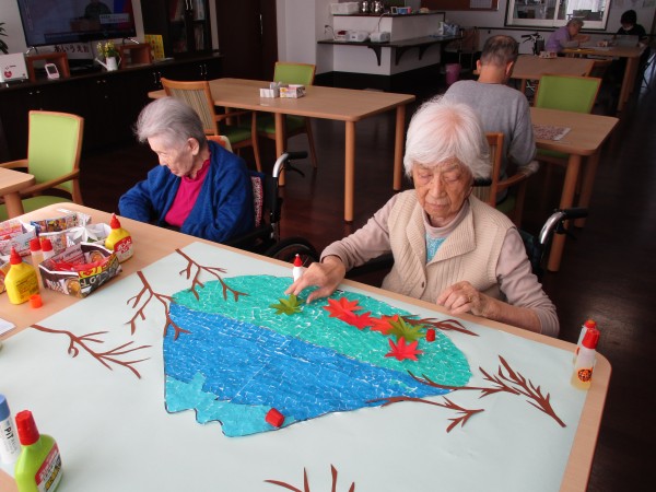 もみじをペタペタ貼って見事な(手前みそですが)富士の完成です。